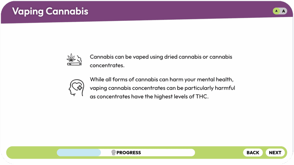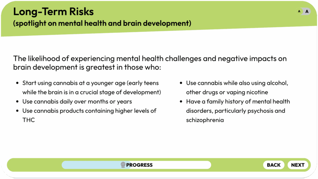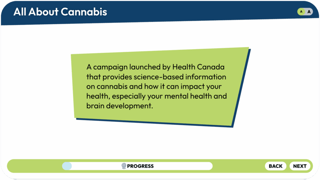 All About Cannabis is a program developed by the Government of Canada to provide science-based information on cannabis, to help you better understand its impact on your health, particularly related to your mental health and brain development.