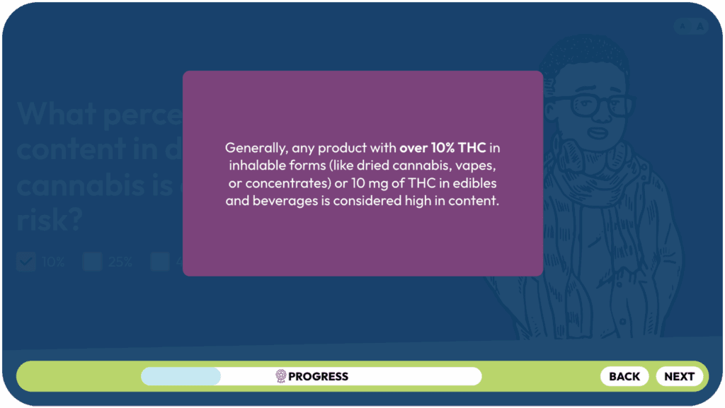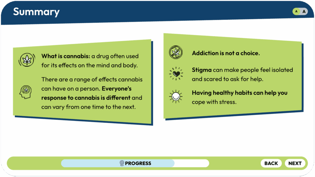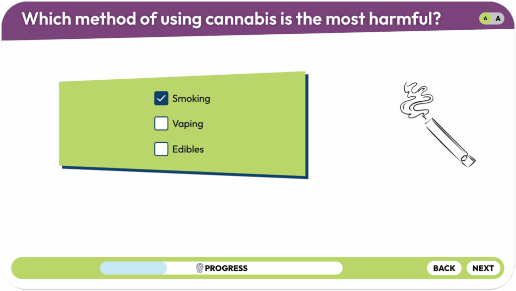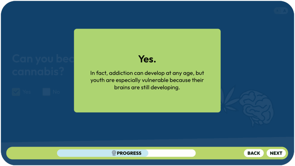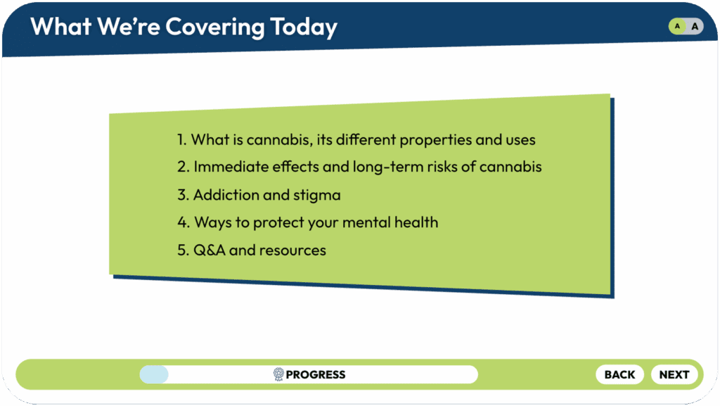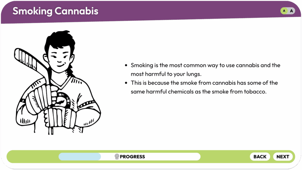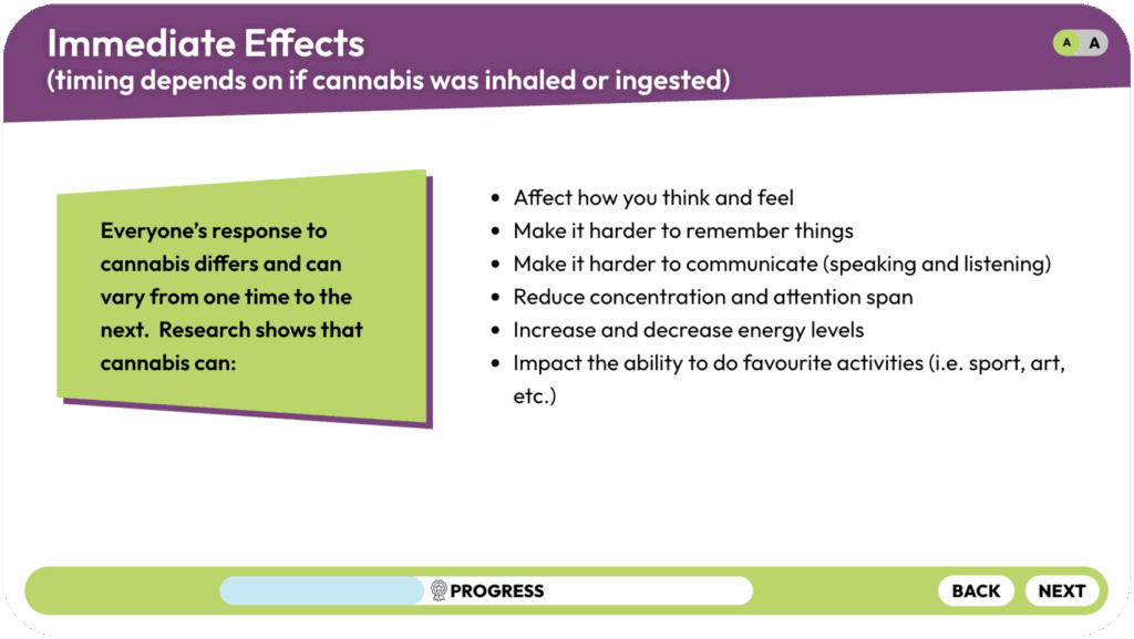 The goal of this presentation is to provide teachers with resources to help their grade 9 to 12 students understand the risks of cannabis use. The program includes:
