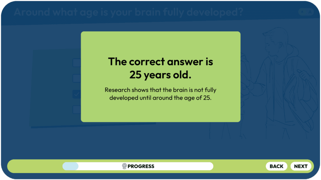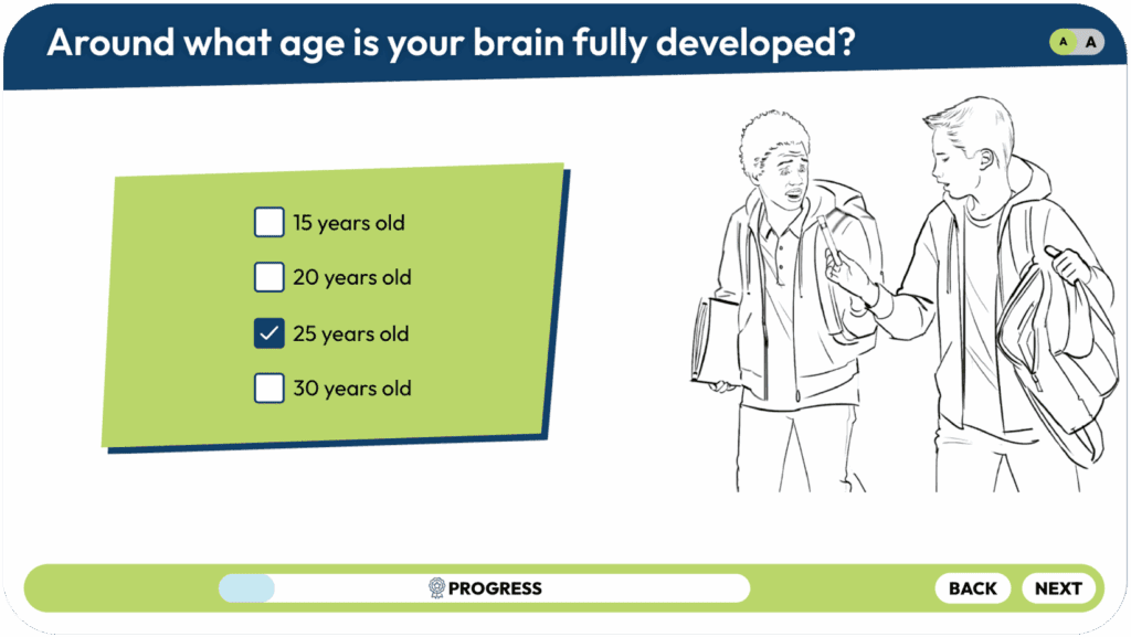 The correct answer is 25 years old. Research shows that the brain is not fully developed until around the age of 25, including areas of the brain responsible for your emotions, memory, and thinking ability. Since the brain continues to grow until the age of 25, using cannabis before this age can harm the way your brain develops and works.