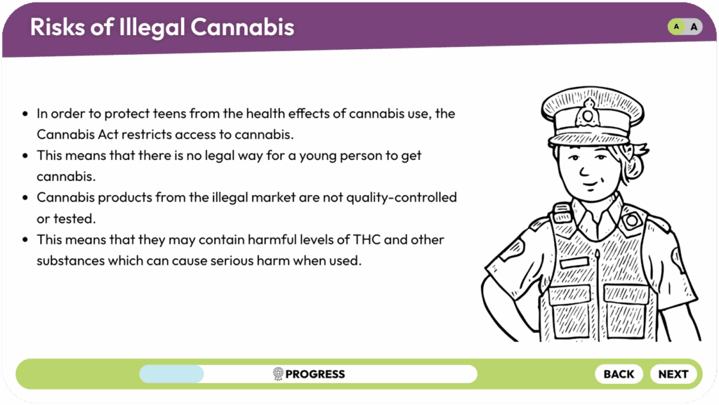 In order to protect youth like you from the risks of cannabis use that were just mentioned, the Cannabis Act, restricts youth access to it. This means that there is no legal way for a young person to get cannabis.