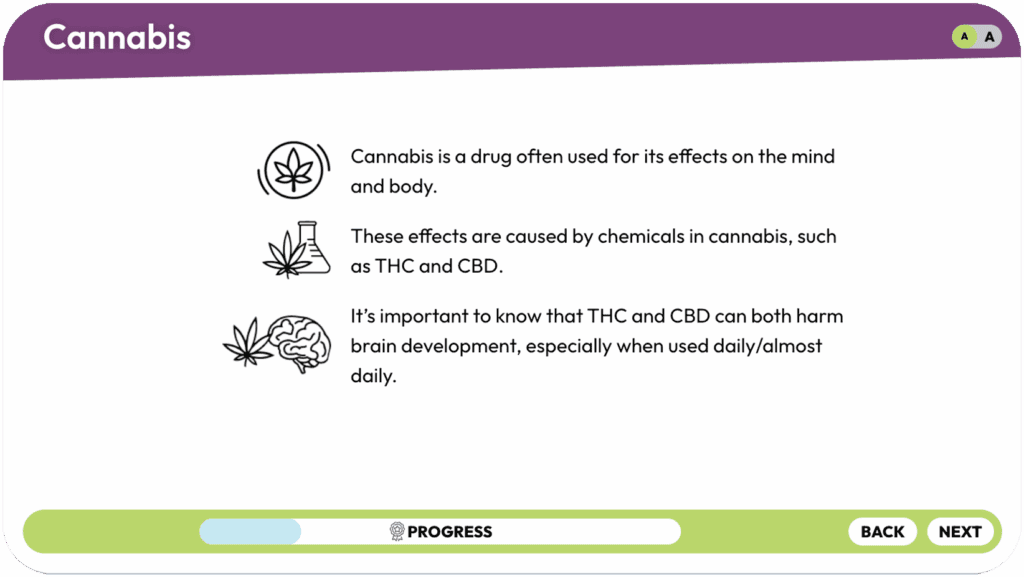 Cannabis is a drug often used for its effects on the mind and body. These effects are caused by chemicals in cannabis, such as THC and CBD. It’s important to know that both THC and CBD can harm brain development, especially when used daily or almost daily.