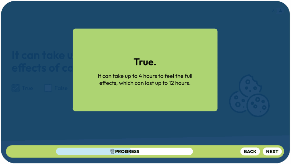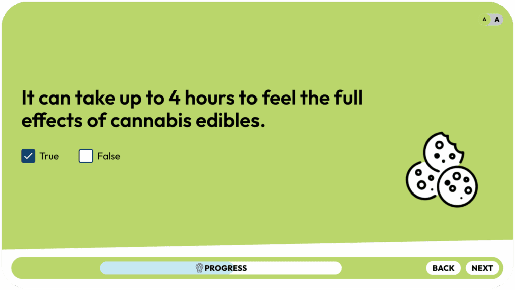 Alright, two more questions. True or False: It can take up to 4 hours to feel the full effects of cannabis edibles.