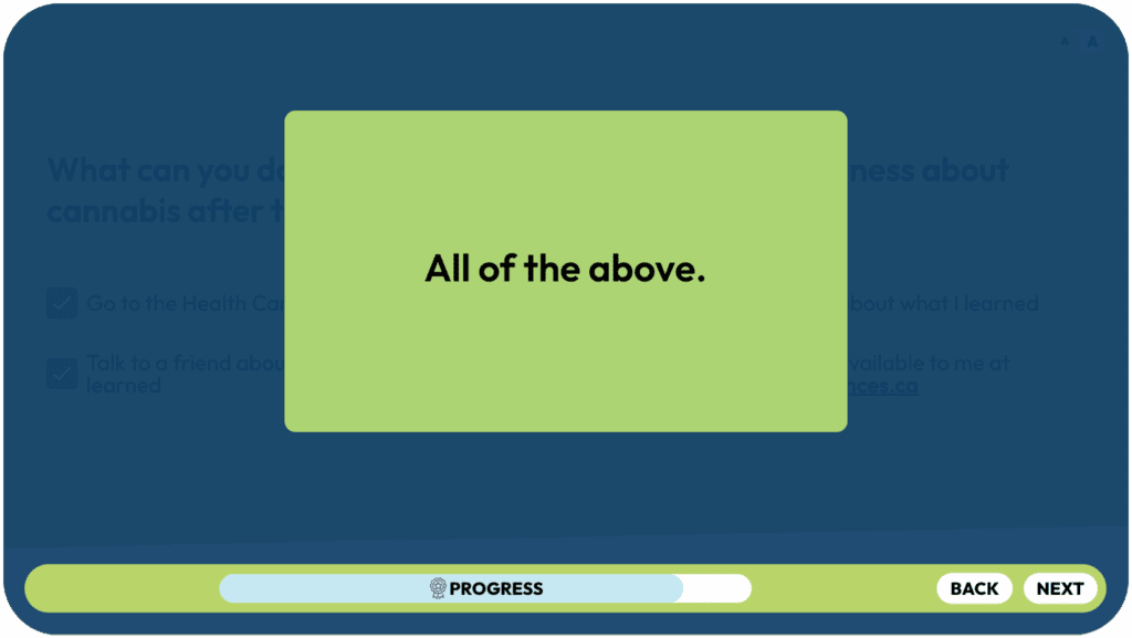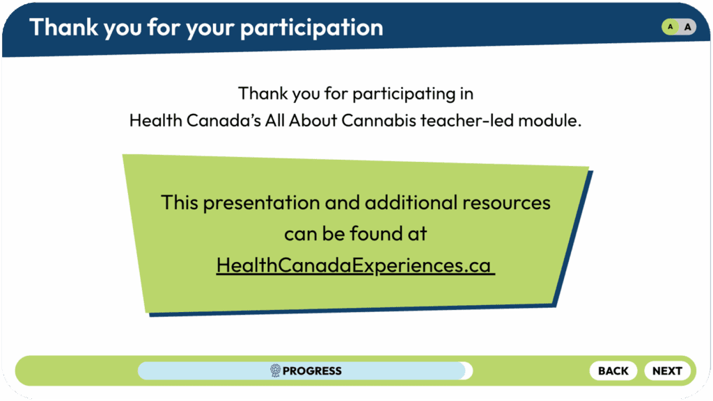 Thank you for participating in Health Canada’s All About Cannabis teacher-led module. We hope you found the content and its delivery informative for your students.