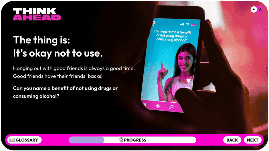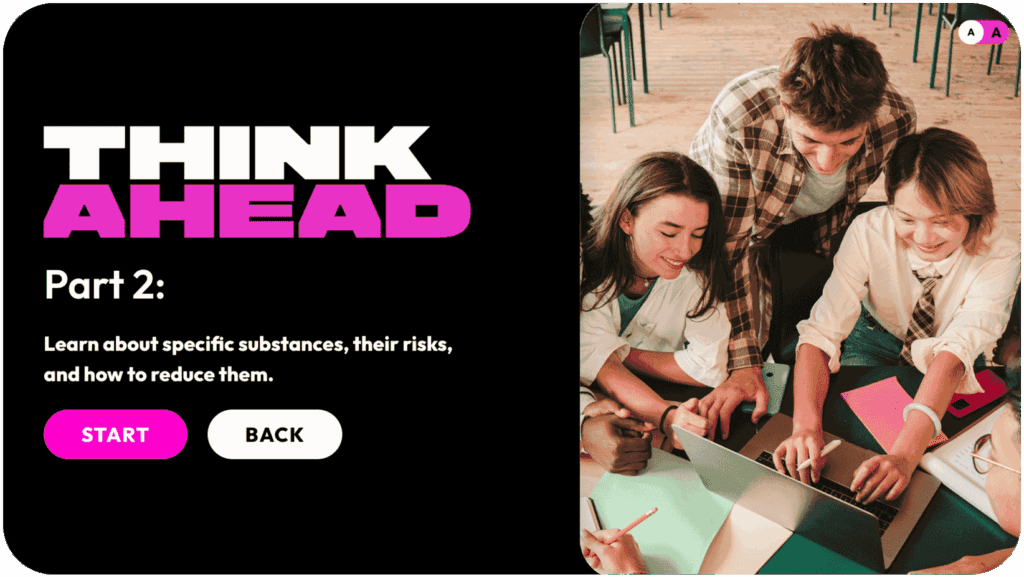 - The Think Ahead: Know the Risks of Substance Use slides are set up and visible to the students
