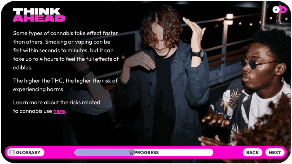 Let’s learn a bit more about cannabis and the risks with different methods of use. Take a look at the info on screen.