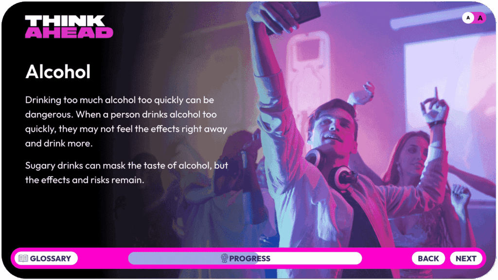 You can learn more about the risks related to alcohol use from the page linked on-screen.