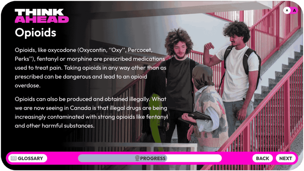 It provides grade 11 and 12 teachers with guidance and resources to help students understand the risks of substance use (cannabis, alcohol and opioids), and how they can reduce those risks, while also encouraging them to learn and understand what’s best for their overall health.