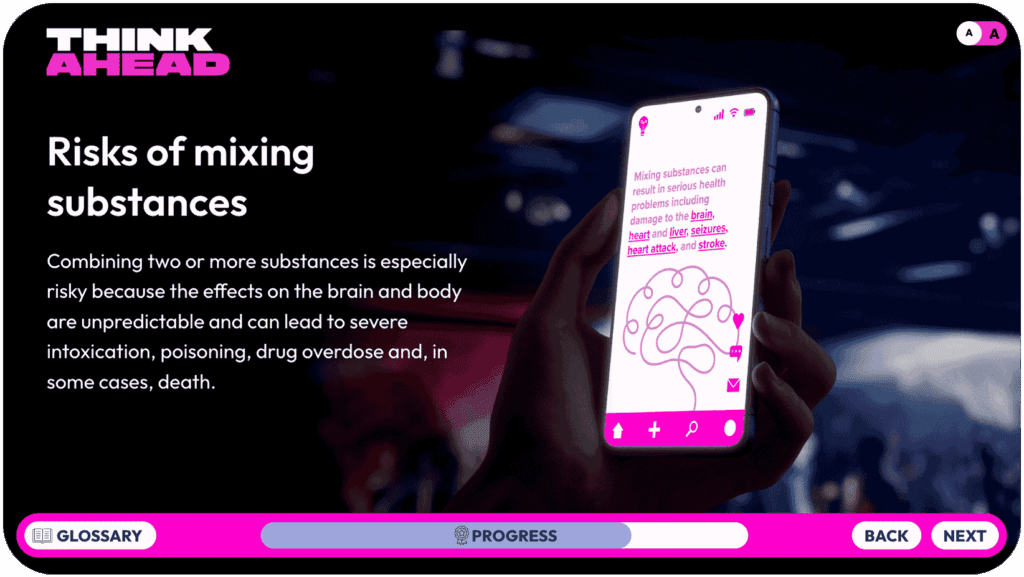 This program focuses on 3 specific substances: cannabis, alcohol and opioids. It also provides information about the risks of mixing or using more than one substance.
