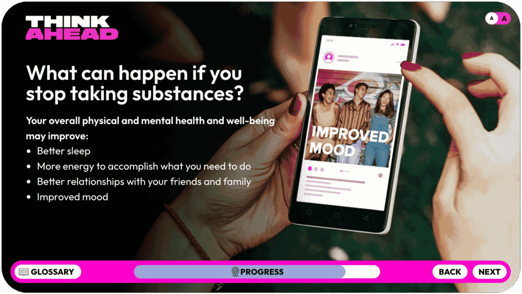 Take a look at the suggestions on the screen for some benefits that can happen when you don’t use substances.