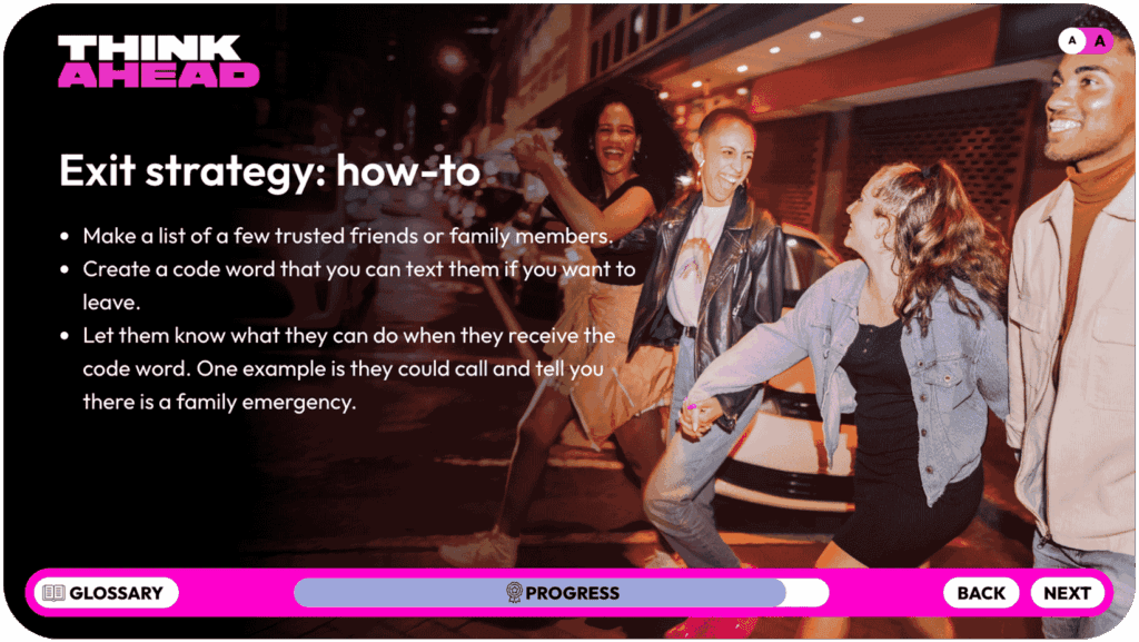 An exit strategy is a plan to help you leave a situation quickly if you feel you will be pressured to stay. Let’s start one together.